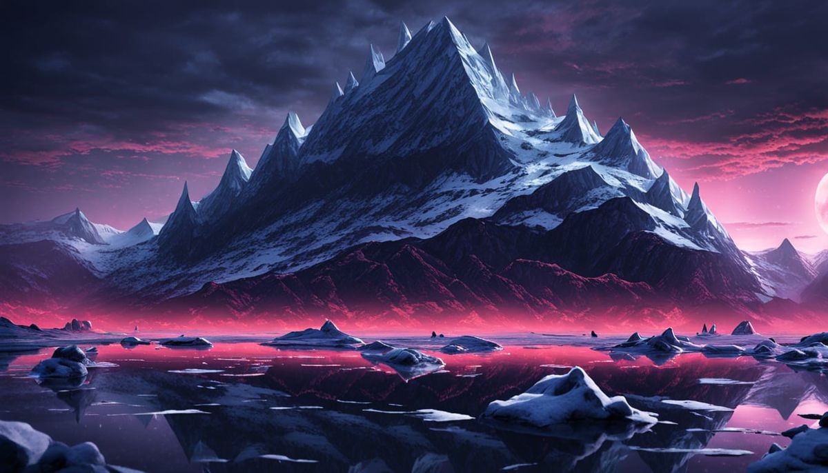 A grainy, dark image of the Marilyn Monroe towers in a futuristic, dystopian setting. Neon lights reflect off an icy surface under a dark sky in a VHS aesthetic.