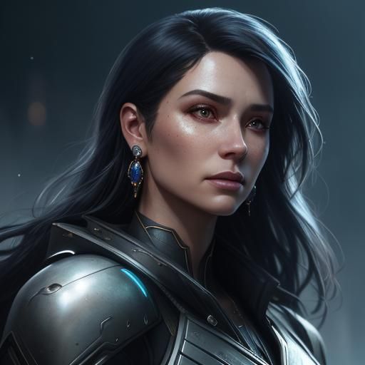 A hyper-realistic digital portrait of a woman with water droplets on her face. She wears an intricately beaded jacket and gazes at the camera, illuminated by soft, warm light against a dark backdrop. The image has a futuristic fantasy aesthetic.