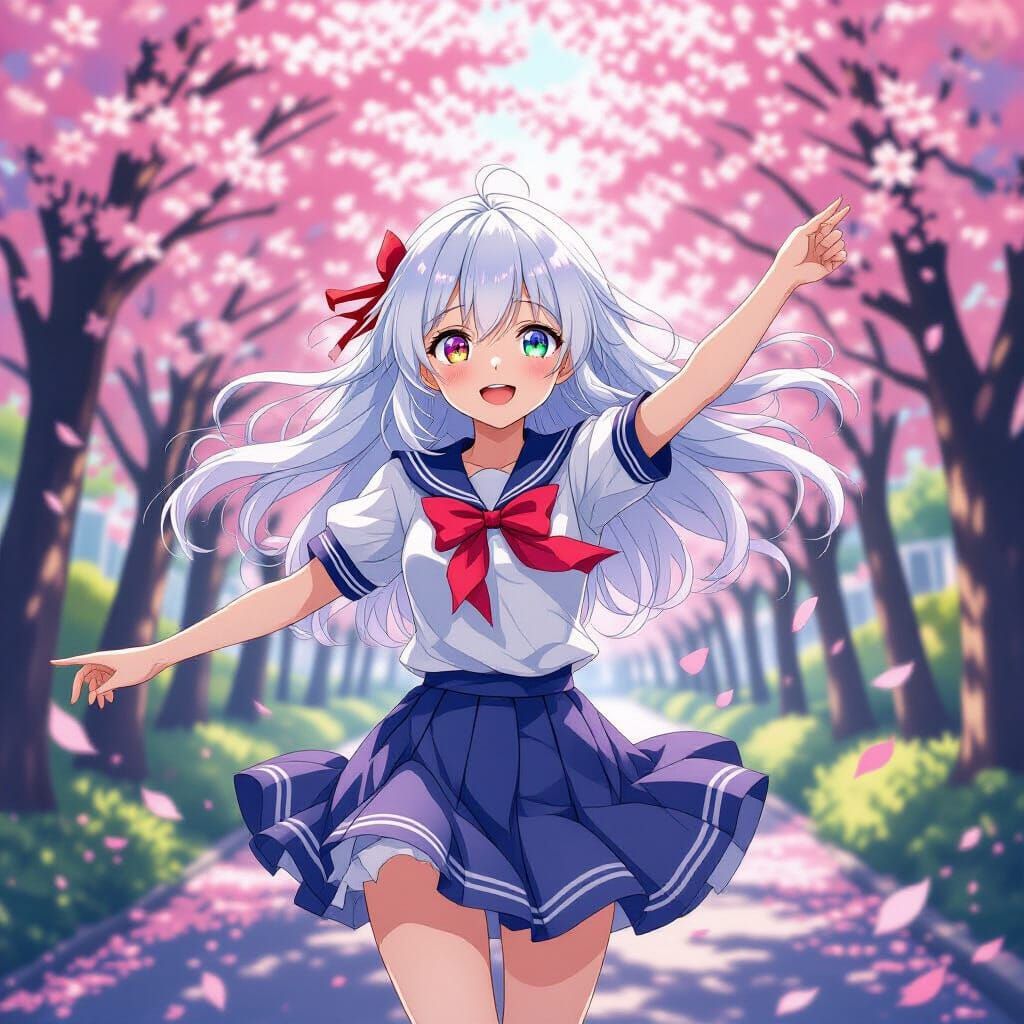 This image shows a girl with white hair and rainbow eyes dancing amidst cherry blossoms. The artwork is reminiscent of anime, with bold lines and exaggerated motion.