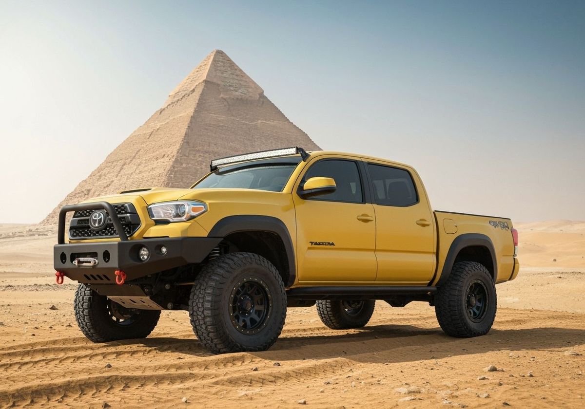This image shows a modified yellow Toyota Tacoma in the Sahara Desert. The truck has off-road tires and a bull bar, with the Great Pyramid of Giza in the background. Rendered in hyperrealistic 8K resolution.