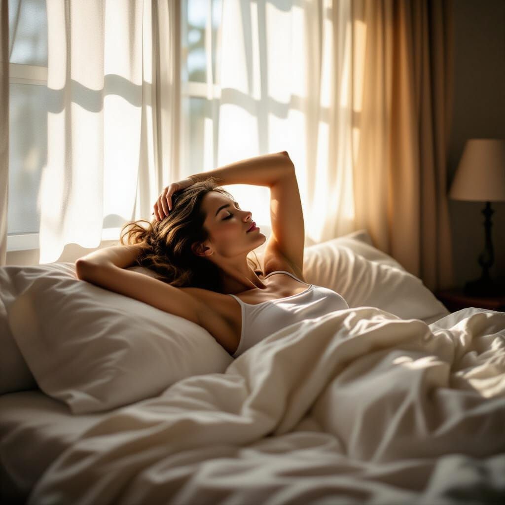 This cinematic image captures a figure stretching in bed, bathed in sunlight streaming through curtains. It evokes a sense of vulnerability and peaceful intimacy, presented with film grain and atmospheric lighting.
