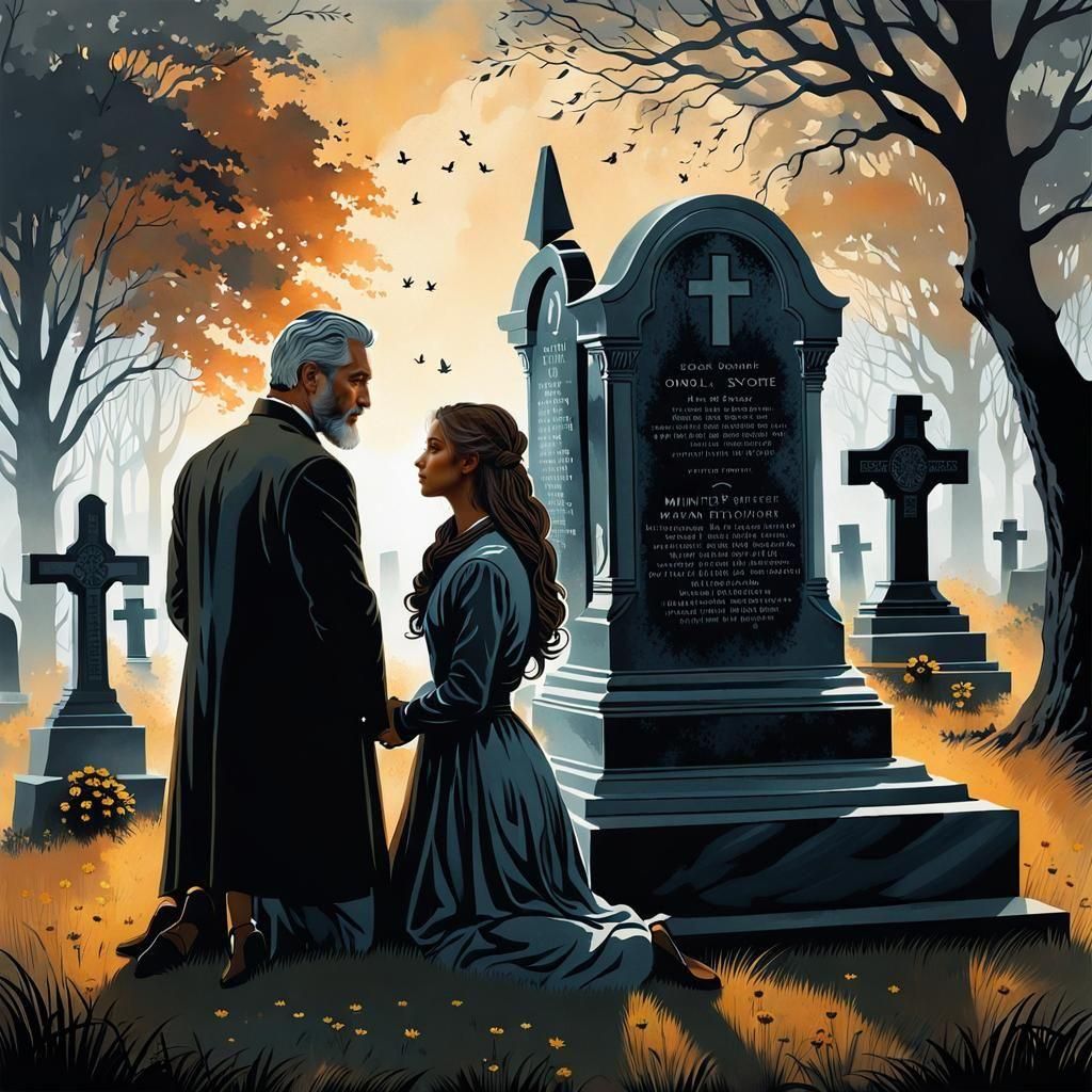 "Double exposure art, a handsome man with gray hair and beard and brown eyes, silhouette of a girl kneeling at a gravestone, extremely emotional and poignant, tender and loving feel, minutely detailed, stunningly magnificent, 32k resolution, oil painting"