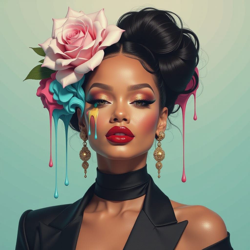 A surreal digital painting of Rihanna with paint dripping down her face. This hyperrealistic portrait features twisted, vibrant colors and dramatic lighting, reminiscent of surrealist painting.