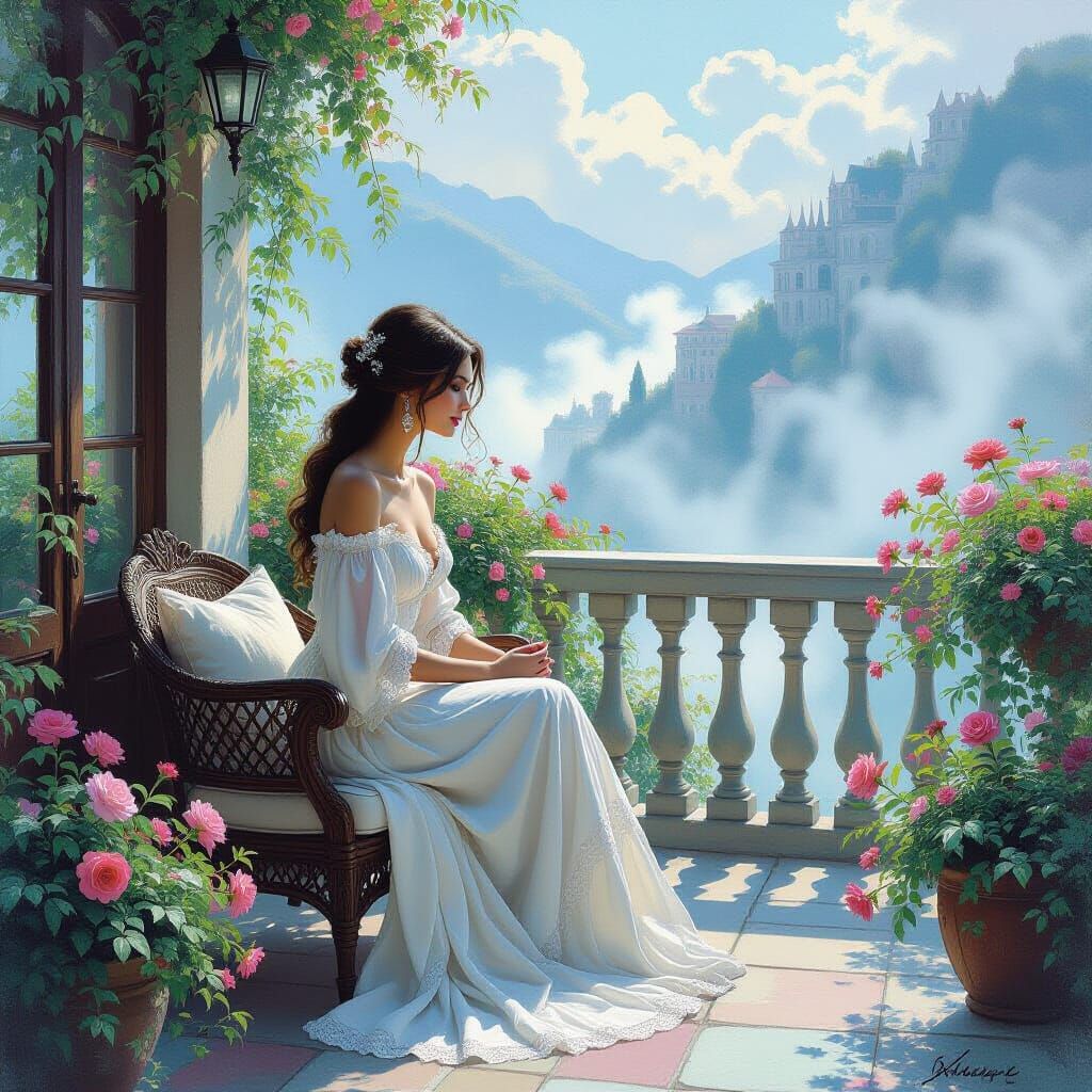 A detailed drawing of a woman on a terrace in a misty landscape. The image showcases a blend of charcoal and gouache textures, exhibiting an epic impressionist style with layered brushstrokes.