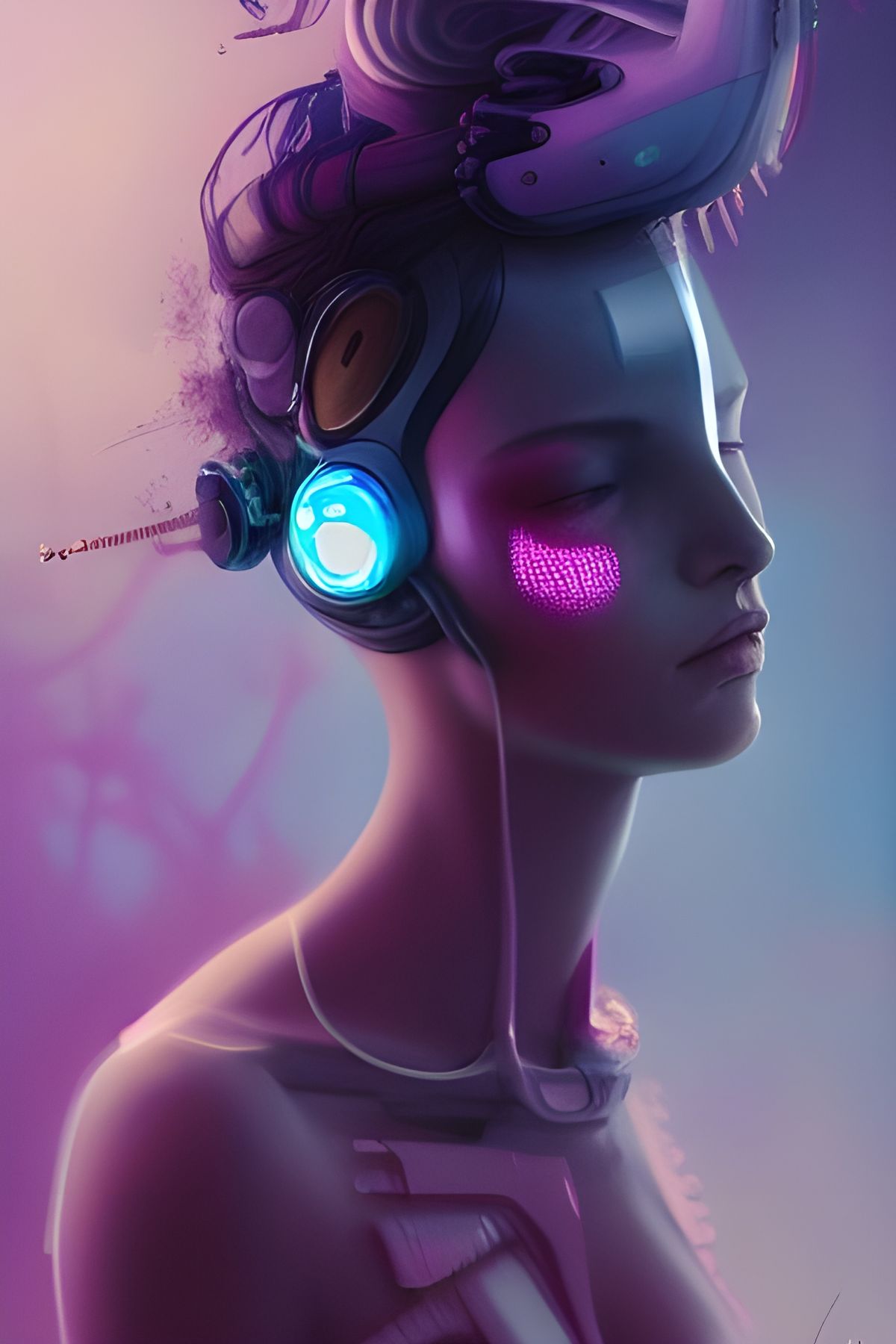 This image shows a cute, happy cyborg hybrid. The artwork features sharp edges, light purple hues, and a holographic aesthetic, rendered as hyperdetailed concept art.