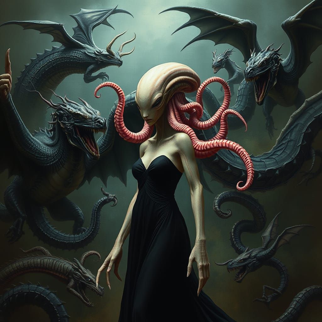 This image shows an alien humanoid woman with tentacles and long fingers, wearing a black dress. The woman is surrounded by dragons and hydras, in a biomechanical surreal style.