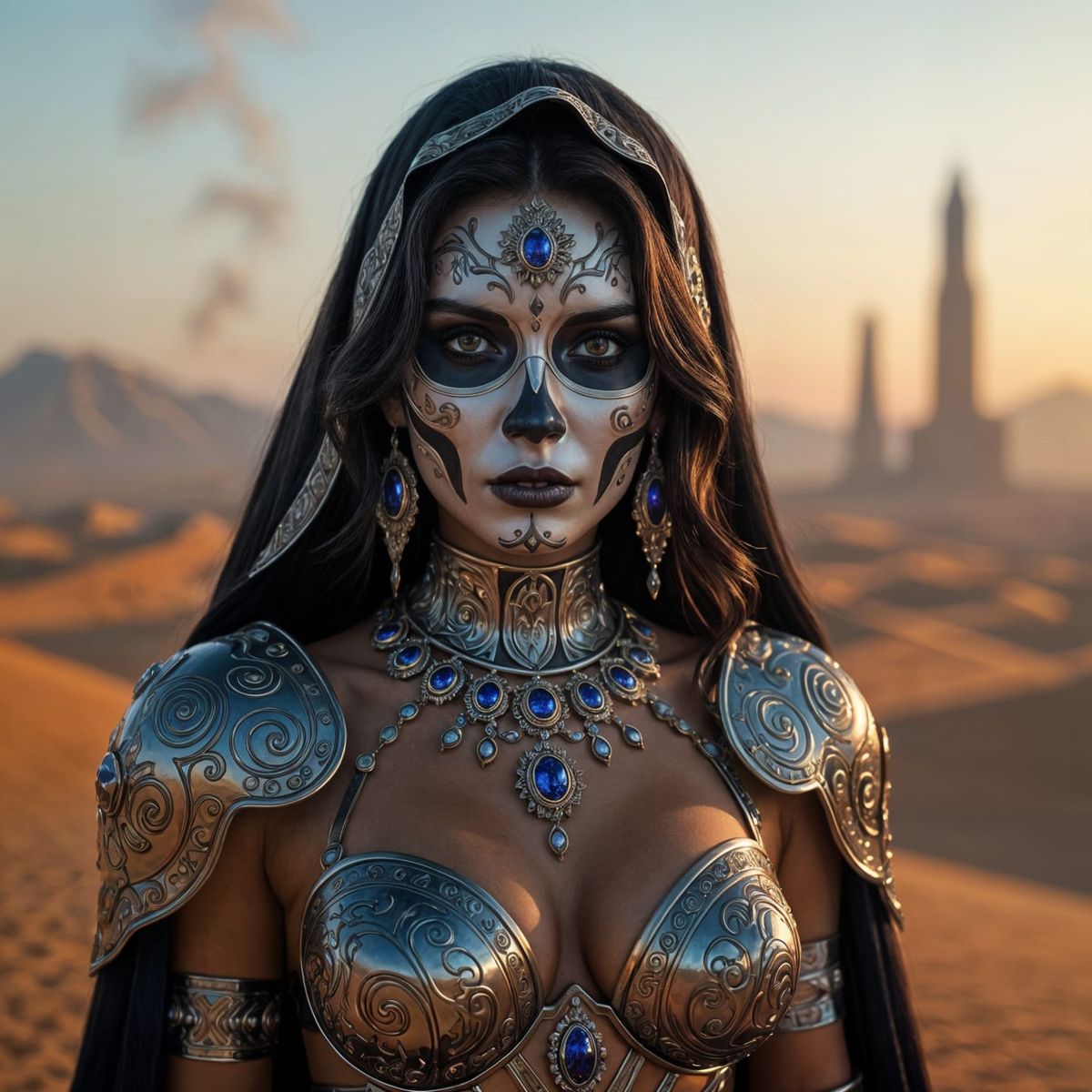 This image shows a metallic woman with Palladium and Chromium armor. The artwork blends Day of the Dead sugar skull aesthetics with luxury jewelry craftsmanship. Set in a hazy desert with distant neon monoliths, in gritty realism.