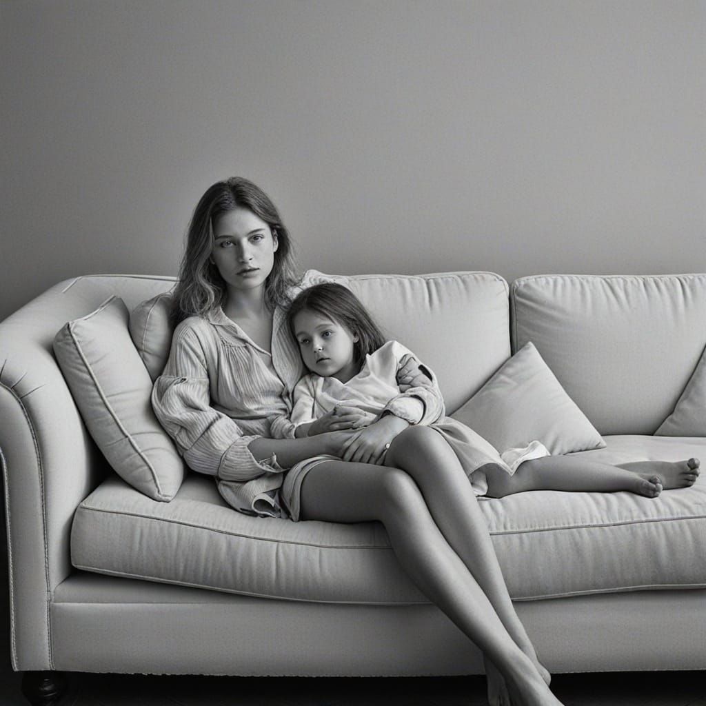 A hyperrealistic medium shot of a girl playing with her doll next to her mother sleeping on a sofa. The image showcases soft textures, warm lighting and pastel colors.