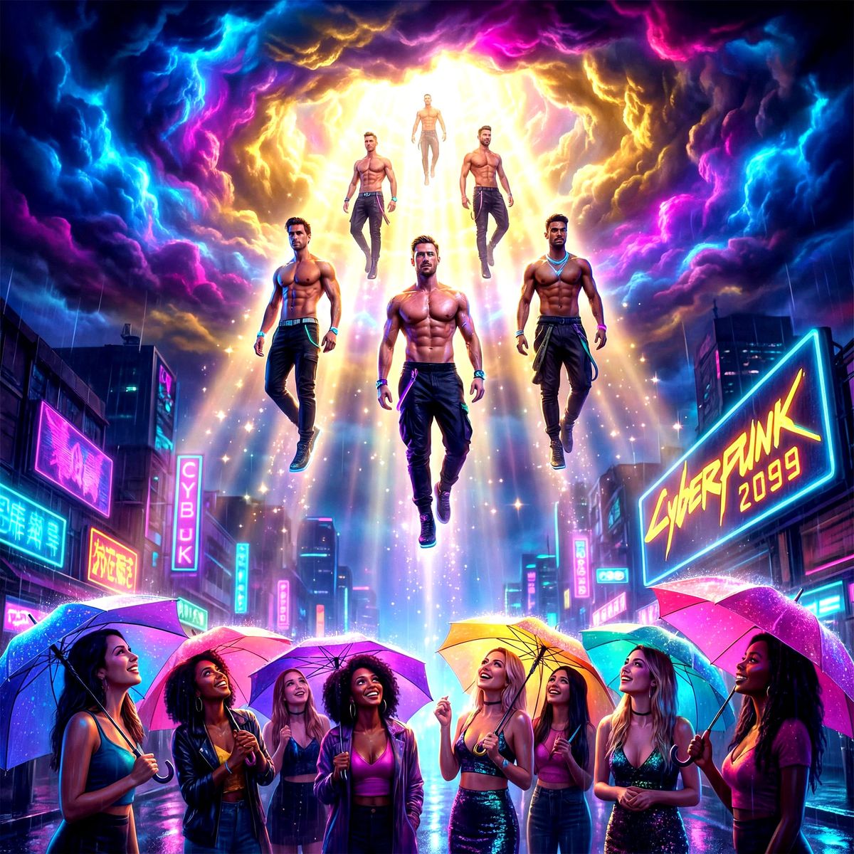 A dazzling, joyful scene where muscular men rain from a neon-lit, stormy sky onto a glistening cyberpunk city street, met by delighted onlookers.