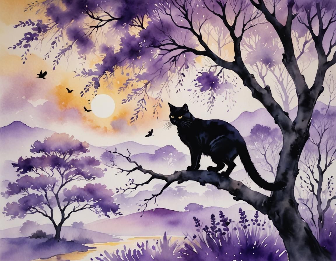 A striking picture of a black cat with a bird on its back in a misty, dreamlike landscape. This watercolor on silk artwork features soft focus, lavender hues, and golden light, capturing a whimsical, ethereal scene with Art Nouveau textures.