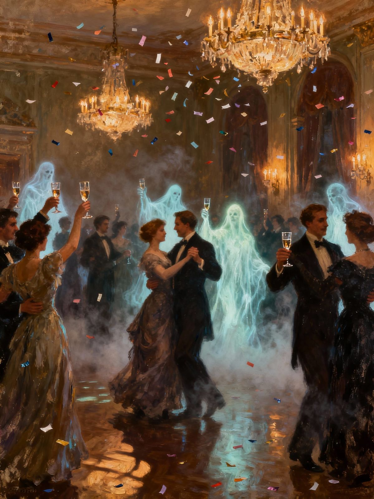 This oil painting depicts a vintage 1900s ballroom party with guests in elegant attire. Ethereal spectral figures subtly mingle with the living, creating an unsettling yet mystical atmosphere with warm, dramatic lighting and rich brushstrokes.