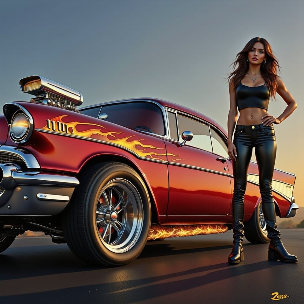 A high-gloss red 1957 Chevrolet muscle car icon with oversized wheels and flames, captured in a dynamic Alcohol Ink style with golden hour lighting.
