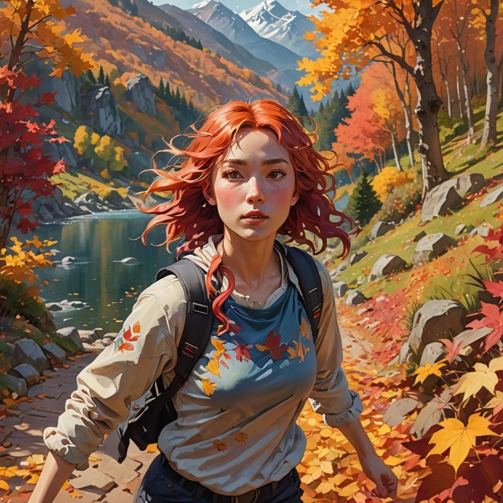 A hyper-realistic anime-style portrait of a vibrant woman with multicolored hair running through an autumn garden. The serene landscape features dynamic lighting and painterly textures.