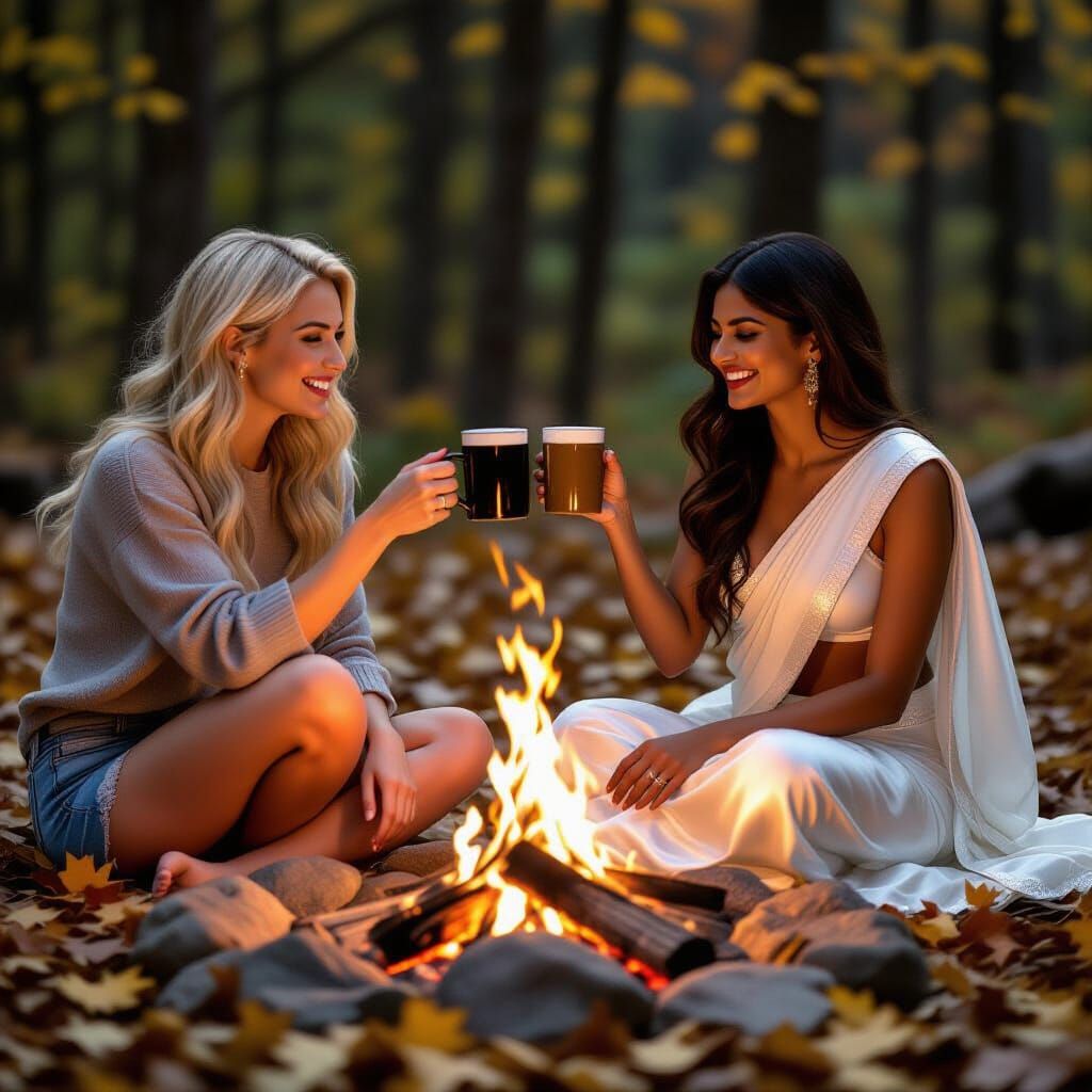 This image shows two women of different ethnicities sitting by a campfire in an autumnal forest, raising their coffee mugs in a toast. The scene evokes a romantic mood with cinematic lighting and a film-like aesthetic.