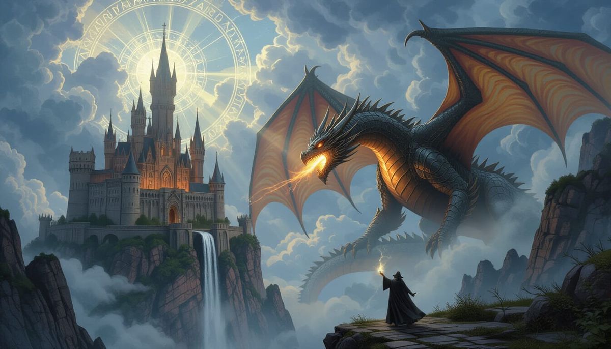This image depicts a majestic gothic castle on a stormy cliff, with a wizard summoning a dragon amidst glowing runes and dramatic lighting. Features hypersaturated colors and volumetric light effects.