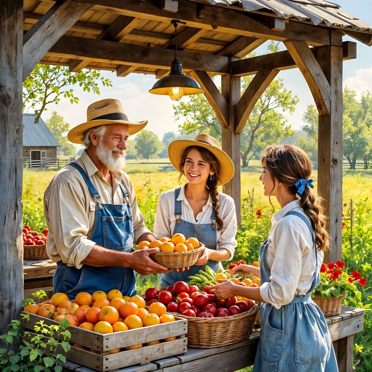 A charming image of a whimsical farmstand with a cheerful, rugged old farmer serving customers. The scene evokes a sense of rural abundance and friendly community interaction.