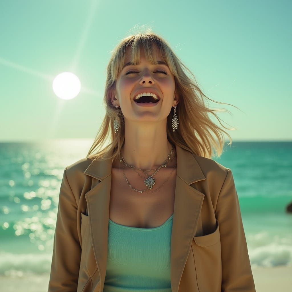 This image captures a woman's enchanting performance, surrounded by a dreamy sea glass green sky and adorned in opulent, Y2K-inspired attire.