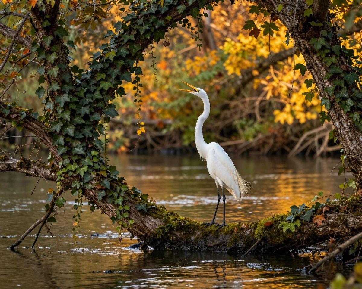 This hyperrealistic image captures a great egret on a mossy branch in a river, with ancient trees leaning over. Golden hour light enhances the surreal, naturalistic scene.