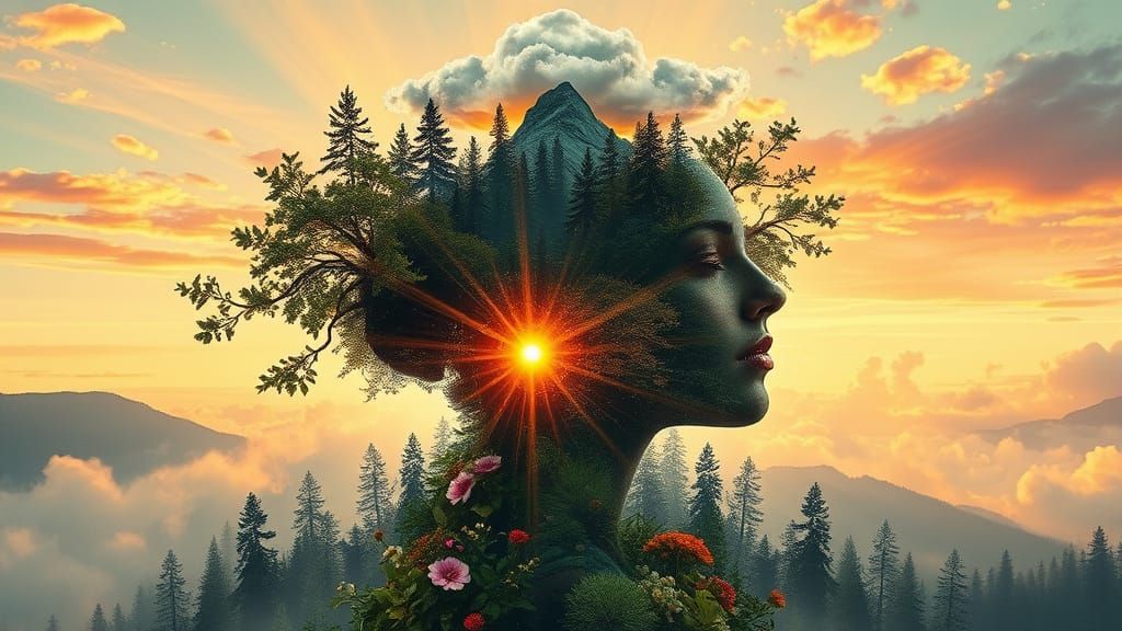 This image shows nature merging with a woman's head in a double exposure. It features a surreal, ethereal landscape with mountains and flowers, rendered in a concept art style with heavenly sunshine.