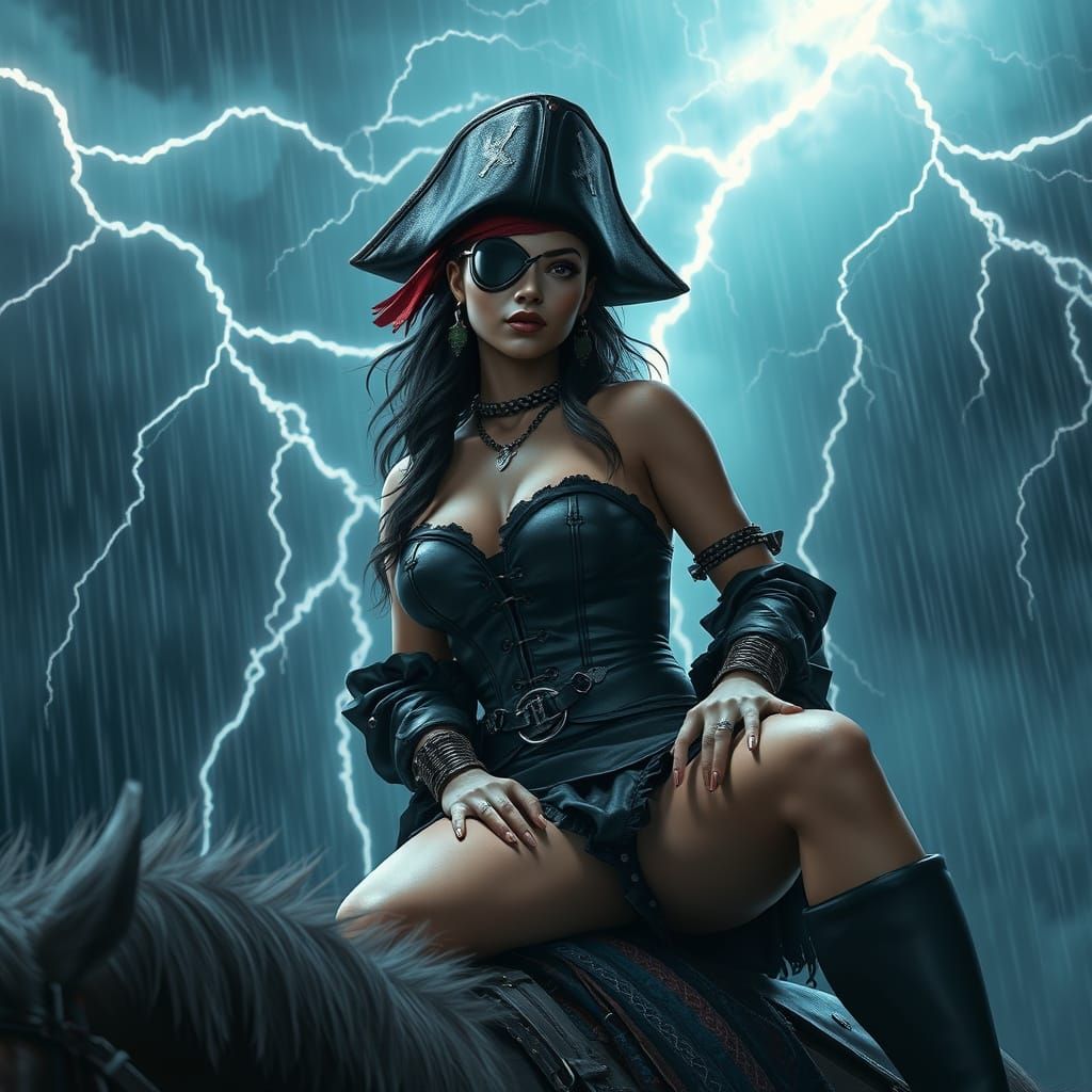 This image shows a Latina pirate in a black corset and eye patch sitting on a man during a thunderstorm. The scene features cinematic lighting and a maximalist, anime-inspired aesthetic with meticulous details, reminiscent of 3D art.