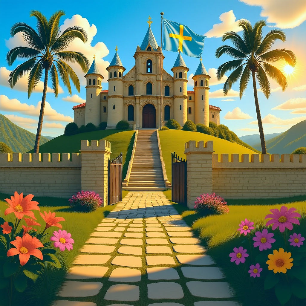 This image shows a walled Italian Romanesque fortress on a tropical island, featuring open gates, a flag, and a visible church. The scene blends strength with an inviting atmosphere under warm sunlight.