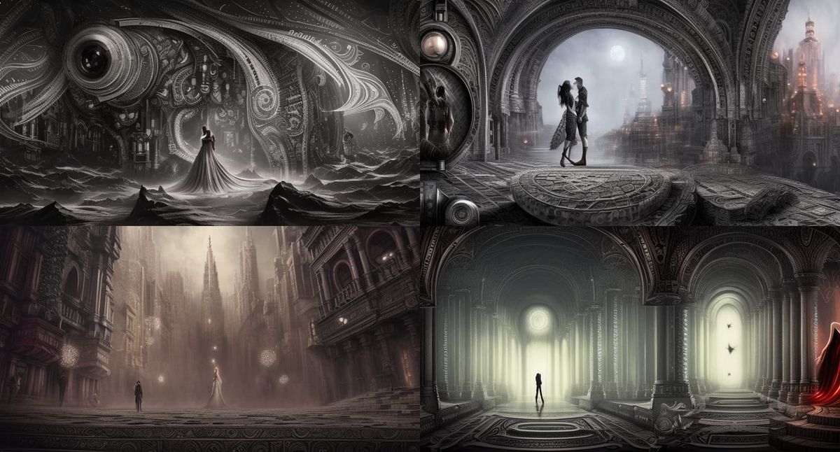 This image shows an ink drawing depicting the concept of binary love. The artwork is detailed and dramatic, created in a maximalist digital style with a cinematic atmosphere.