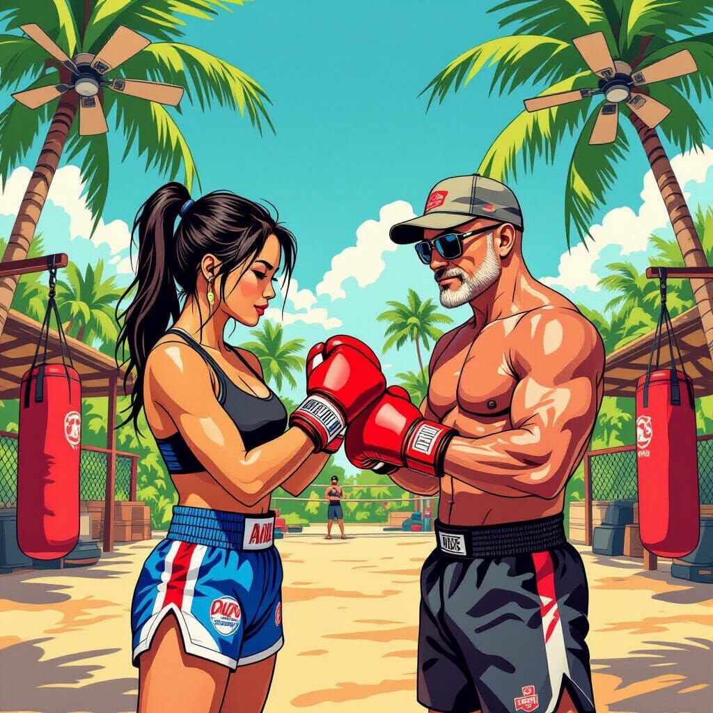 This image shows a fit Thai girl wrapping the hands of a middle-aged man at an outdoor Muay Thai training camp with palm trees, punching bags and overhead fans. It's a vibrant cartoon-style illustration with bold lines and dynamic textures.