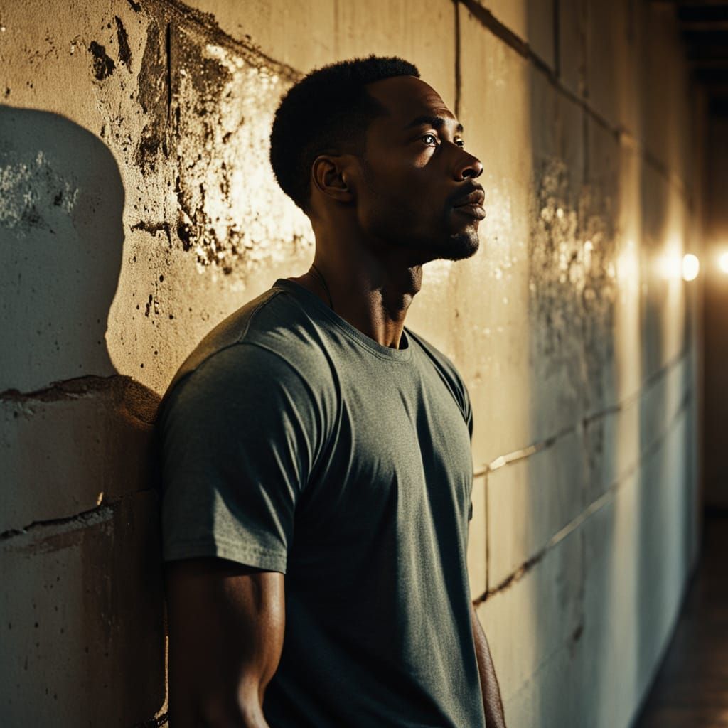 This image shows a young African American man in shorts and a T-shirt, standing against a gymnasium wall. Shot in film noir style, sweat glistens on his face in the warm, golden light.
