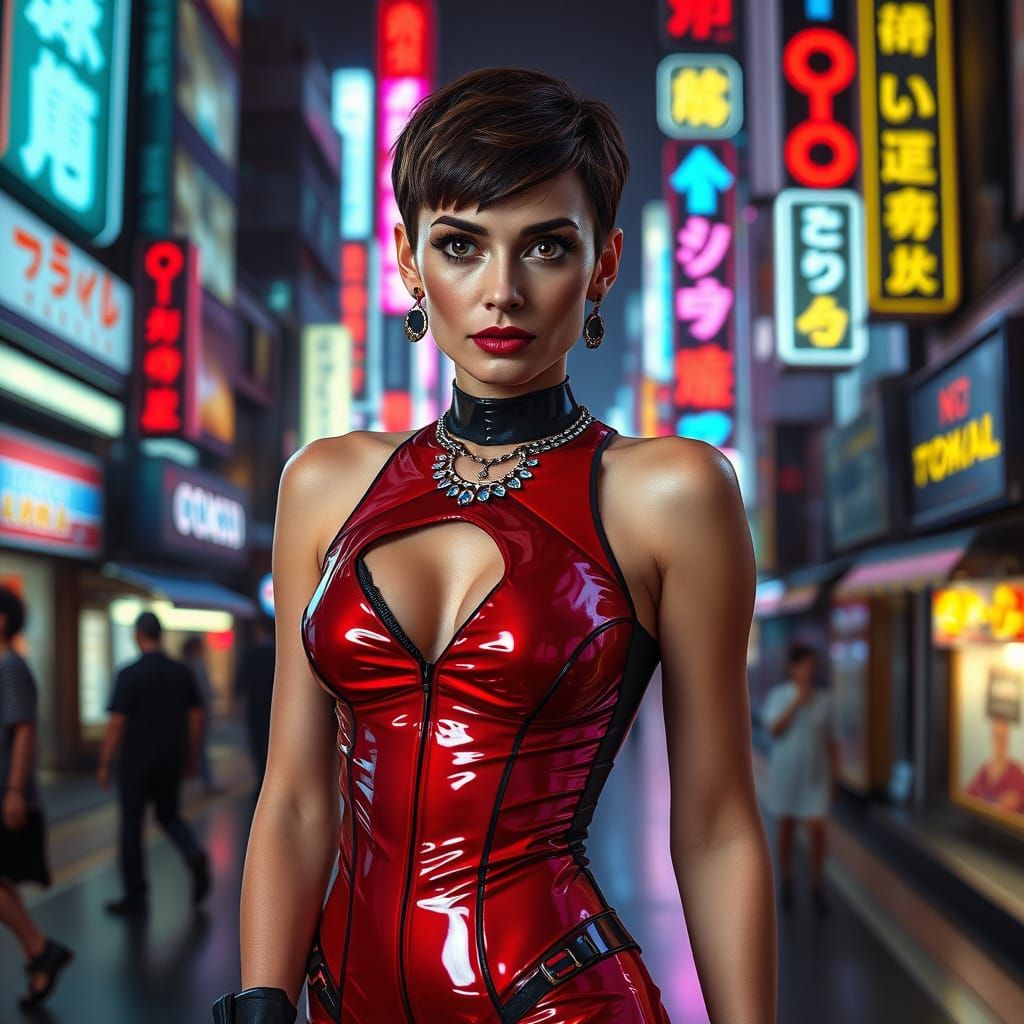 This image shows a futuristic cyberpunk version of Audrey Hepburn in Neo Tokyo. The figure's scant clothing features a flashy, colorful, neon aesthetic.
