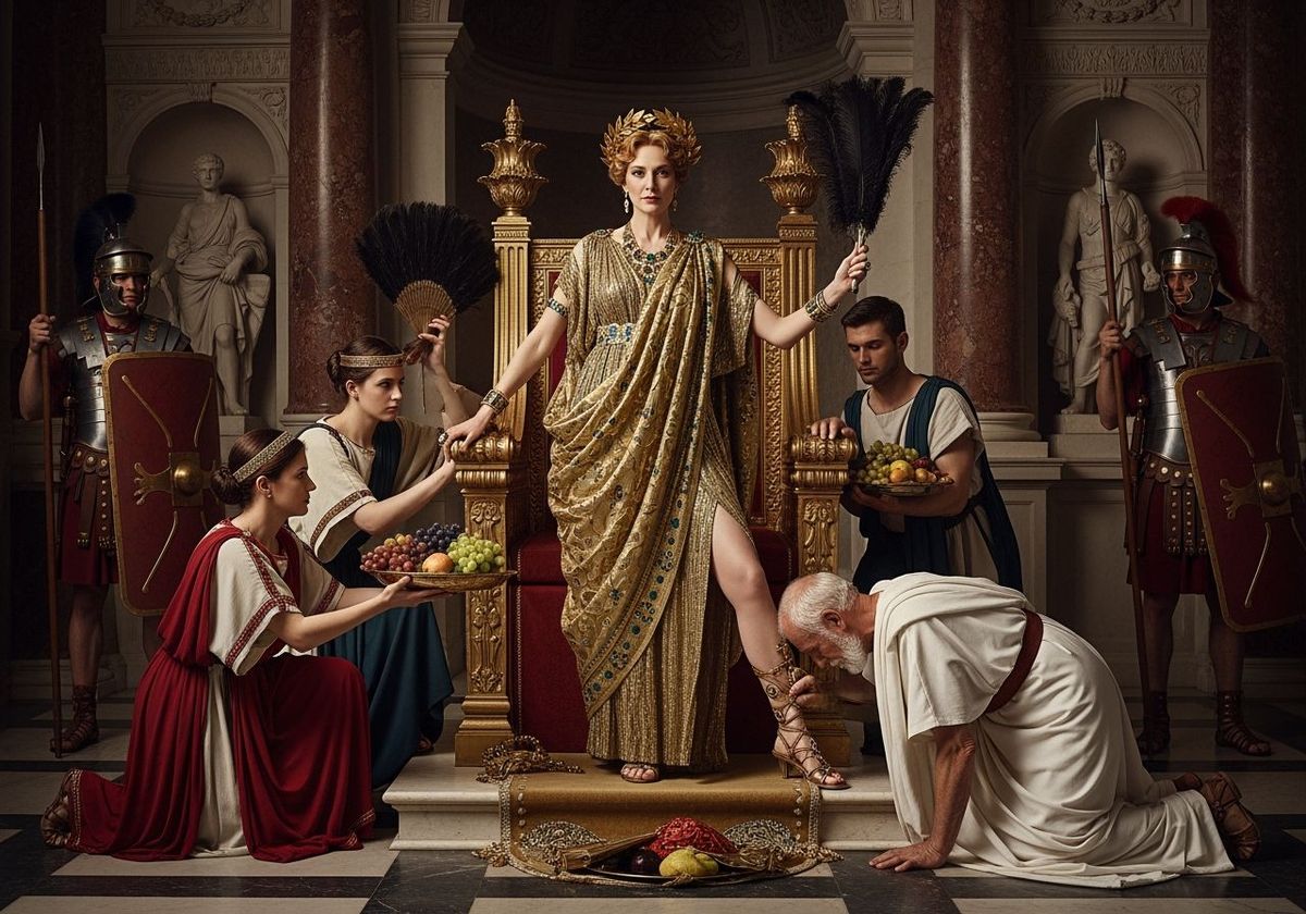 This image depicts Empress Messalina in her opulent throne room, adorned in gold and emeralds. A servant offers fruit, while a senator bows before her, capturing a moment of imperial power and Roman grandeur.