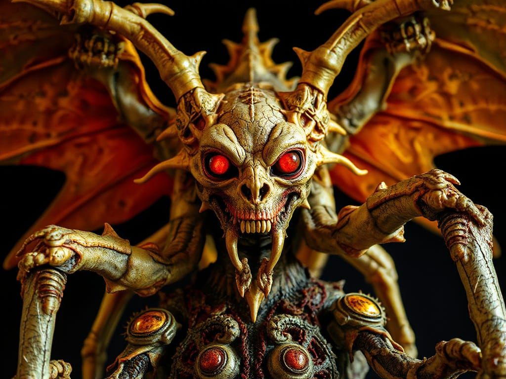 A striking picture of a surreal chimera monster taxidermy exhibit. This humanoid tarantula dragon displays contortionist poses and albino skin, featuring glowing red eyes and unfolding wings in a Giger-esque fusion.