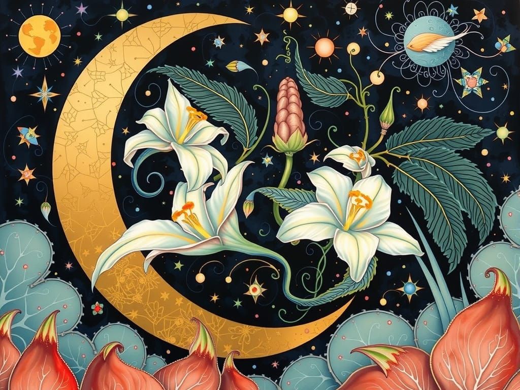 A vibrant fractal art piece displaying intertwining flora, fruits, and the Fibonacci sequence. The image is adorned with tiny colorful flowers, seeds, and small fruits in a psychedelic style.