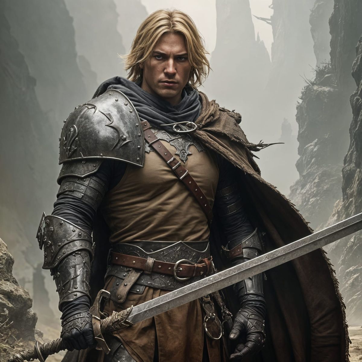rugged muscular blonde male mercenary in dented armor, wearing a chainmail chestplate over his chest ,beige tunic with gold trim, holding sword