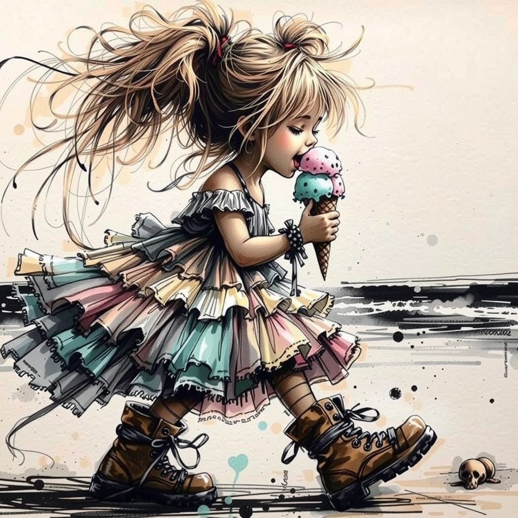A charming illustration of a young girl in a frilly pastel dress, confidently striding forward with a joyful expression and an ice cream cone, set against a dreamy abstract shoreline background with vibrant colors and soft textures.