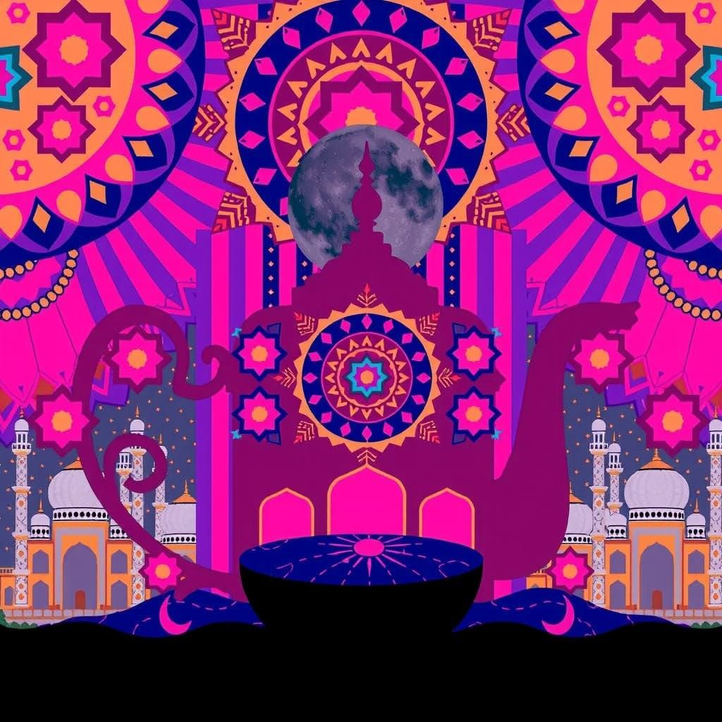 This image is a unique blend of three contrasting environments: a desert night, a Persian palace, and a teapot silhouette, all combined in a creative logo style with high detail.