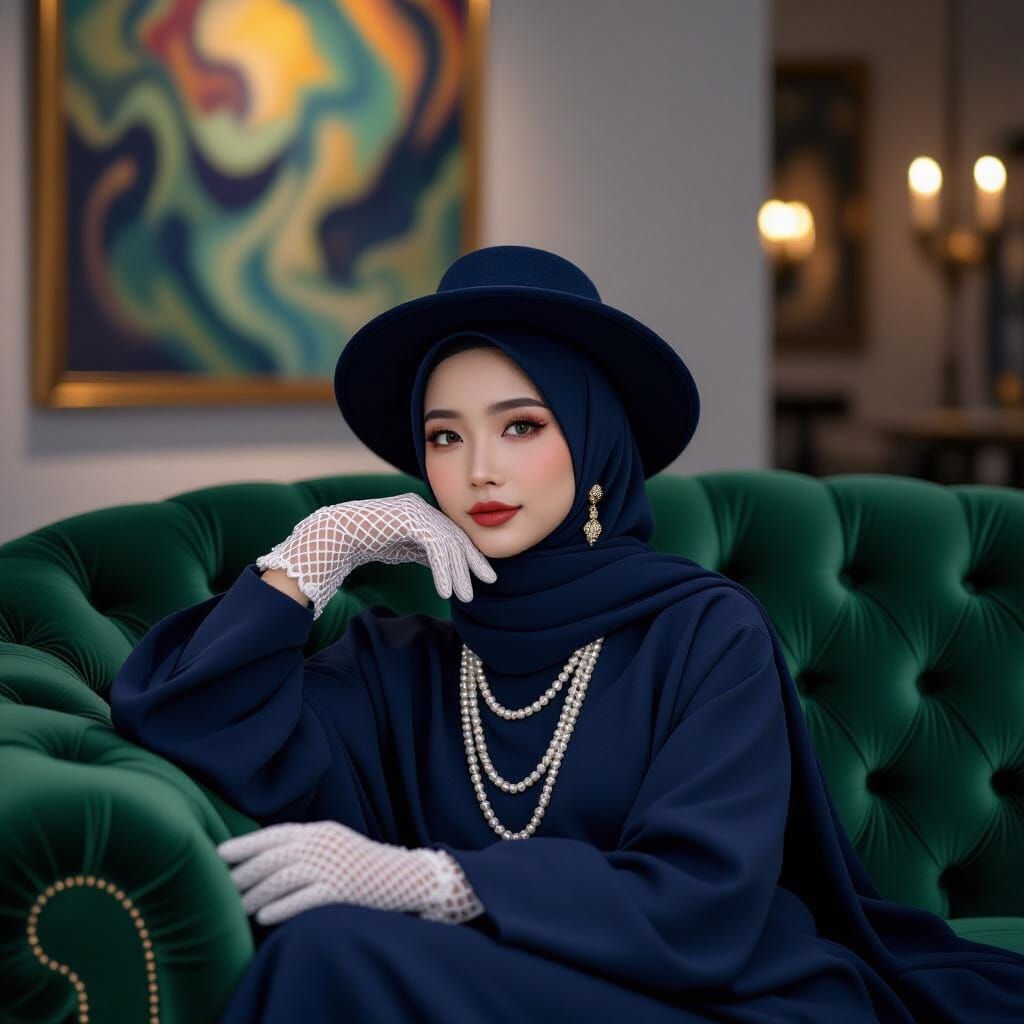 A high-quality, cinematic photograph of a young, trendy, hijab-wearing Korean beautiful woman reclining gracefully on a plush, emerald-green velvet sofa in a dimly lit modern art gallery. She wears a wide-brimmed navy felt hat, a delicate, sheer ivory fishnet glove on one hand that rests gently on the ...