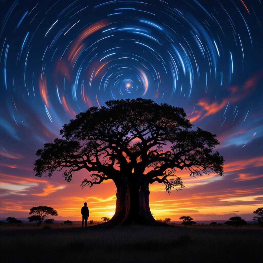 A solitary baobab tree is silhouetted against a vibrant pre-dawn sky filled with swirling blues, oranges, and purples. Star trails add to the drama of this photorealistic fine art photograph.