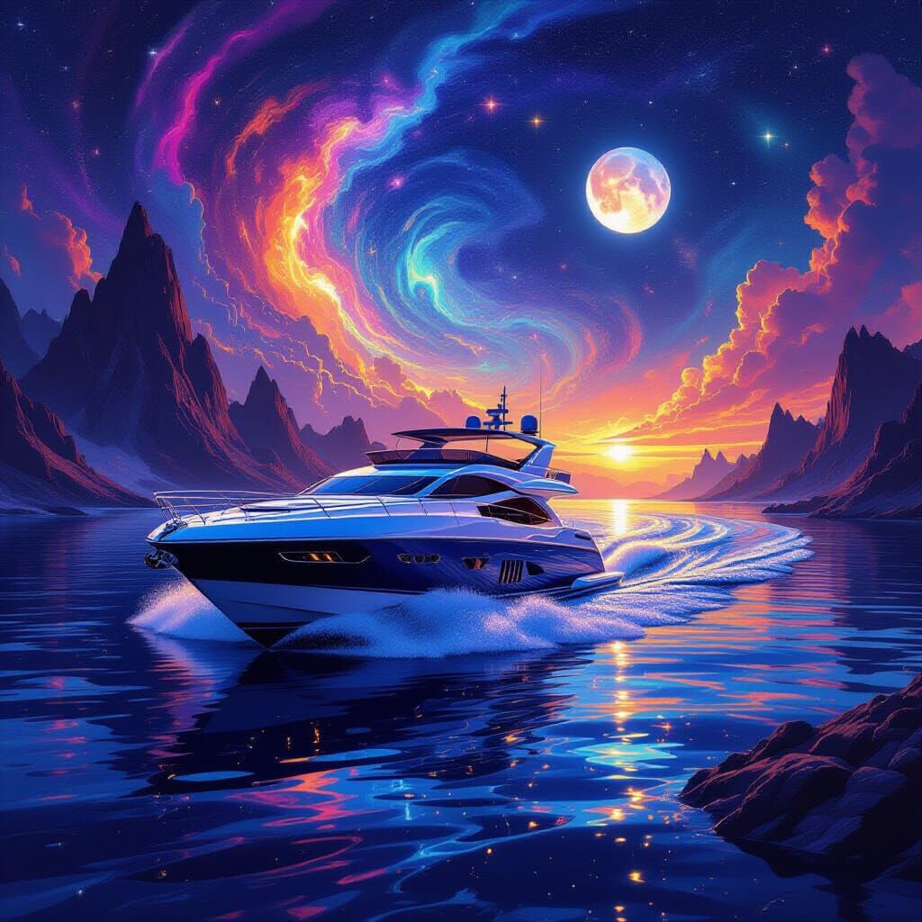 This image shows a yacht sailing through a vibrant nebula. The vessel's hull reflects swirling stardust and crystalline formations in a surreal, dreamlike style reminiscent of digital concept art. The landscape features jagged mountains and rivers of light.