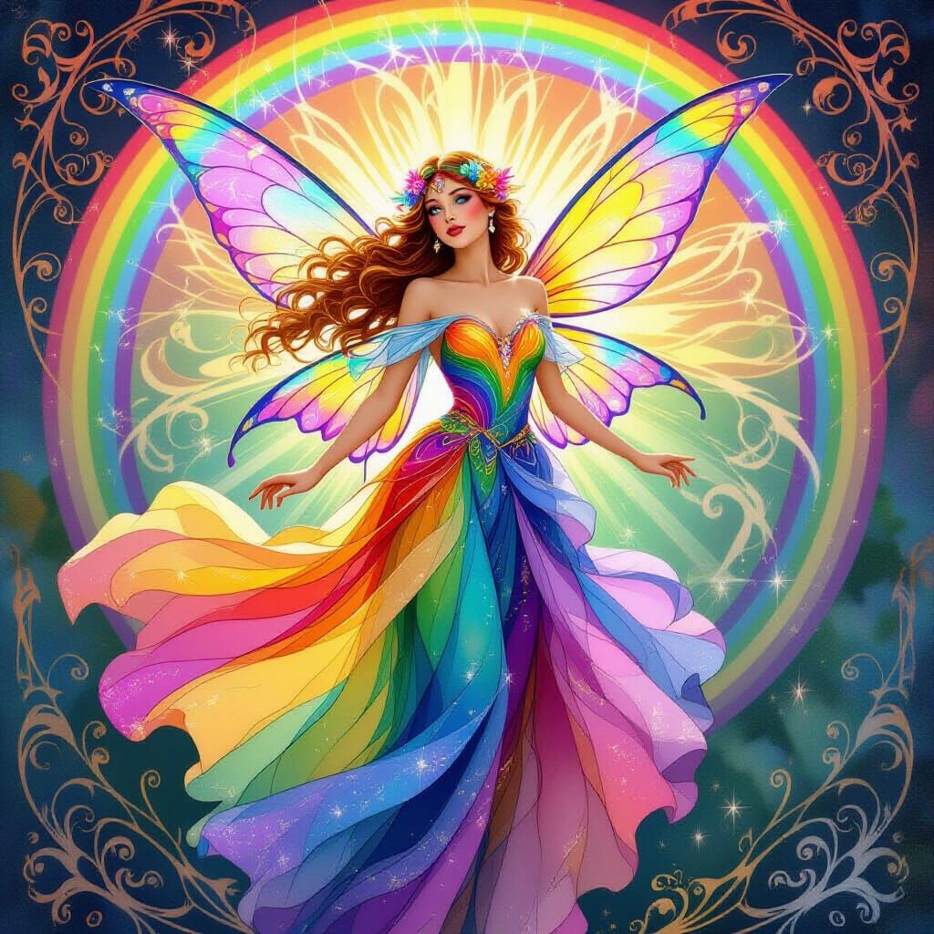 This image shows a glowing fairy in a rainbow dress. The figure is set against a rainbow backdrop in an art nouveau style with swirling patterns and soft, ethereal lighting.