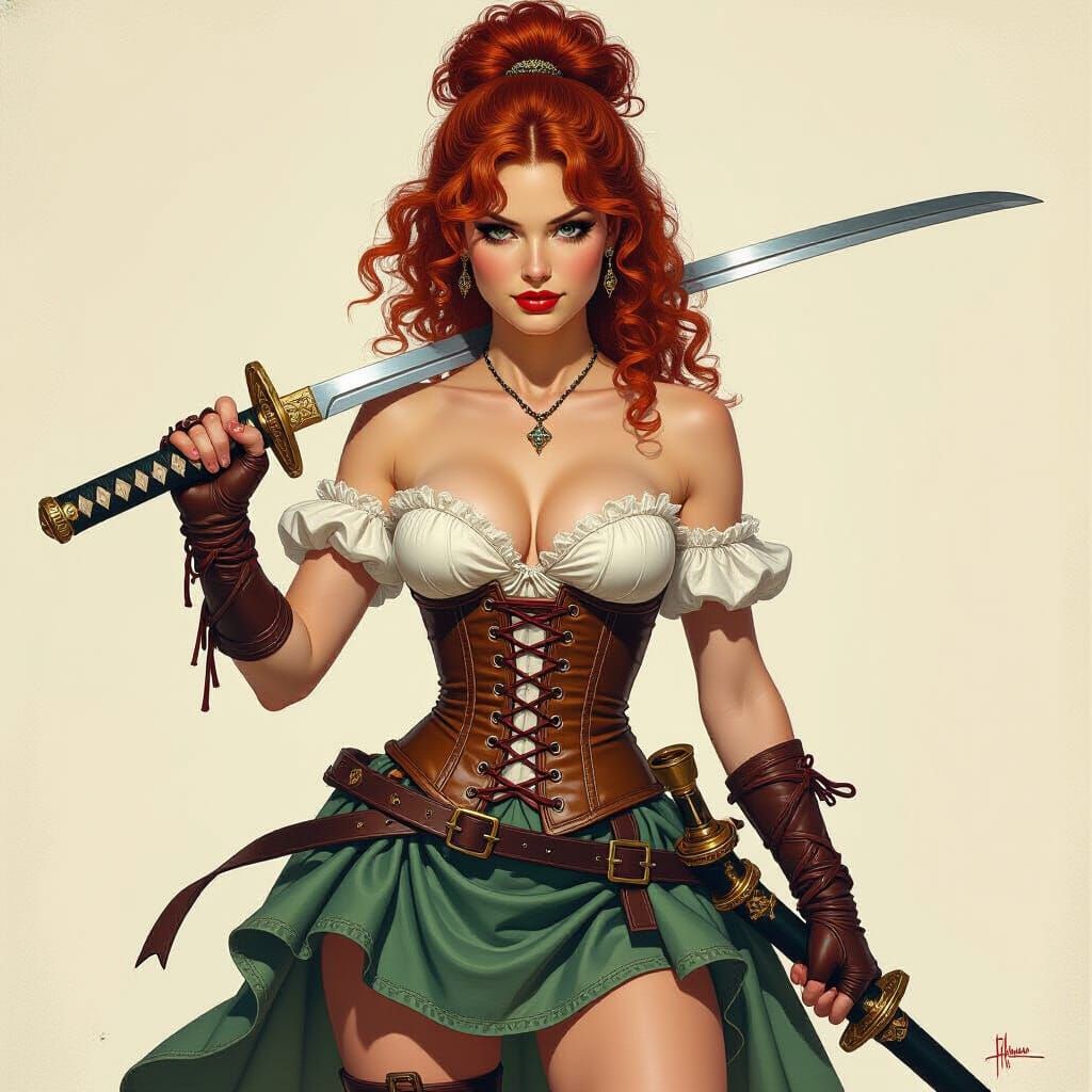 This image shows a red-haired woman in fantasy attire holding a katana. The artwork features highly detailed, realistic elements with vibrant, oil-painted textures reminiscent of classic fantasy art.