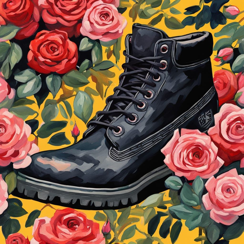 A vibrant gouache painting featuring black timberlands and blooming roses. This impressionist masterpiece showcases thick, textured brush strokes and rich, contrasting colors on canvas.