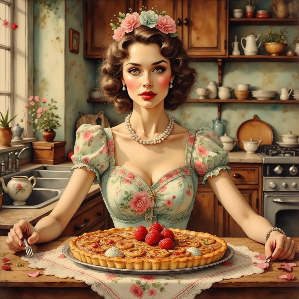 A 1950s housewife in a floral dress is in a vintage kitchen with a detailed medieval tart. The scene evokes a nostalgic, retro aesthetic with warm, golden lighting.