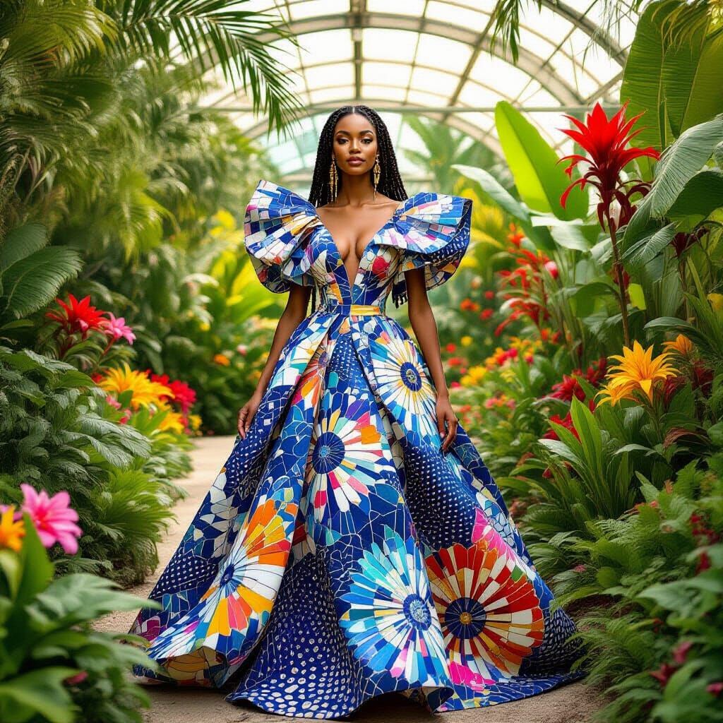 A striking picture of a Black woman in a sculptural gown, showcasing Shibori dyeing and African geometric elements. The scene is set in a lush botanical garden with soft, diffused light and Art Deco elegance.