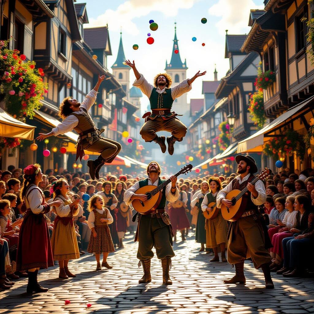 This highly detailed, photorealistic painting captures medieval street performers entertaining a joyful crowd with acrobats, jugglers, and music in a sun-drenched town square.