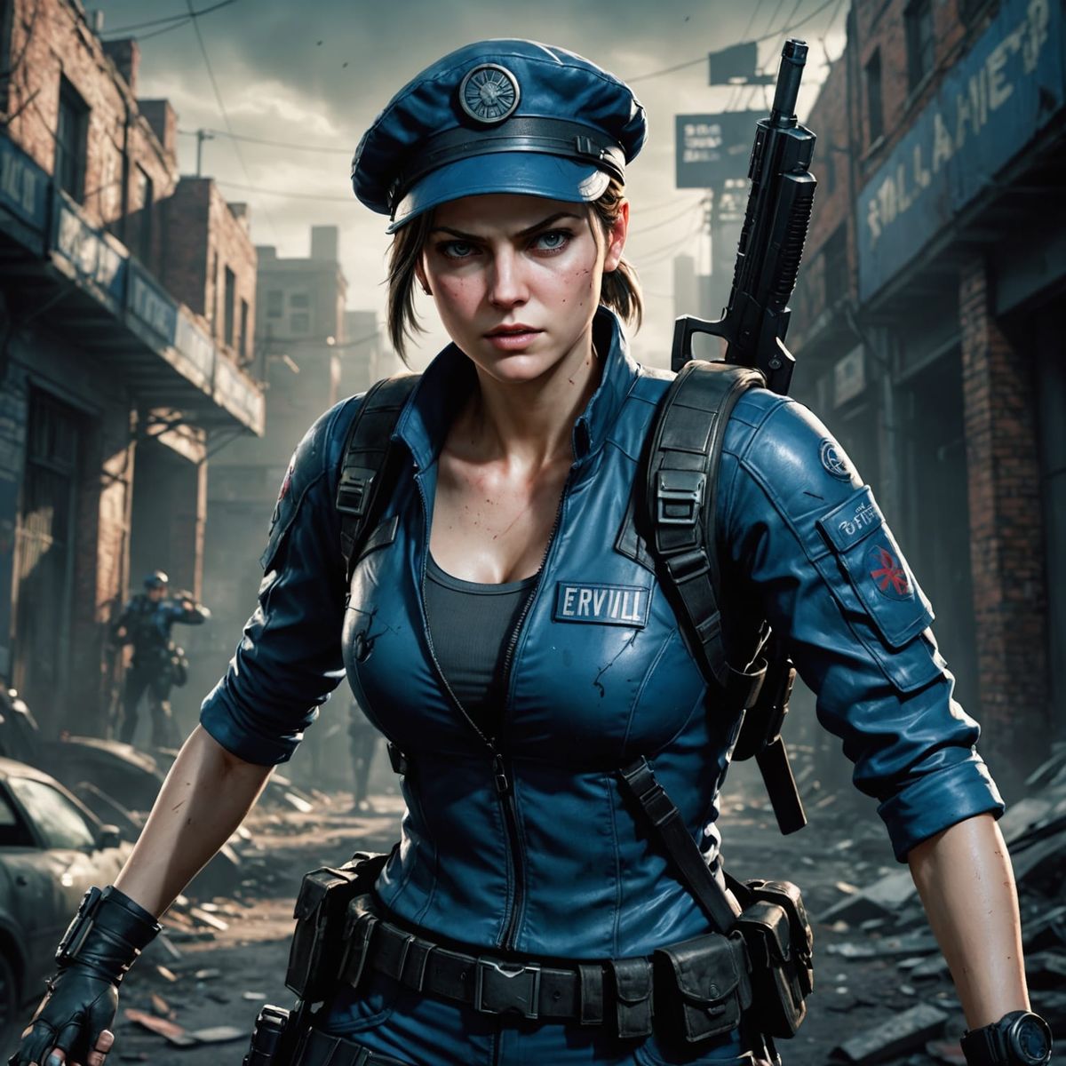 A realistic digital painting shows Jill Valentine in a dynamic action pose. She wears a tactical outfit and signature beret, with cinematic lighting and moody shadows.