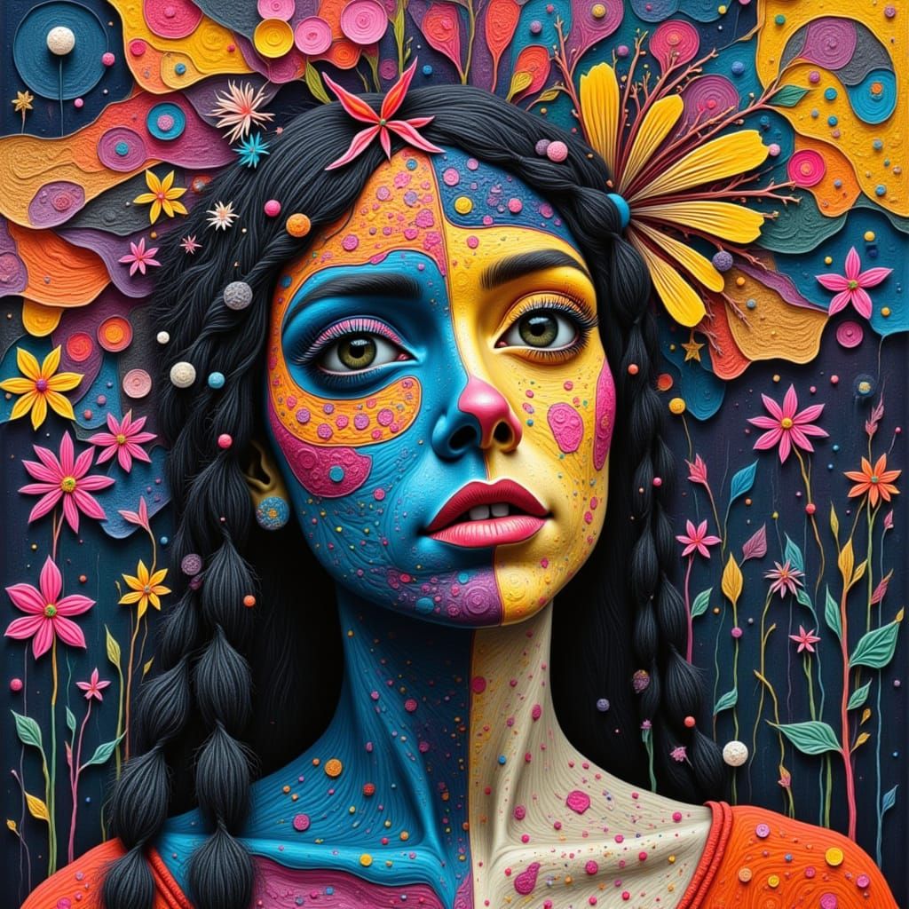 This image showcases a detailed collage scrapbook drawing with psychedelic and bohemian carnival elements. It features vibrant colors and geometric influences, rendered with dramatic cinematic lighting.
