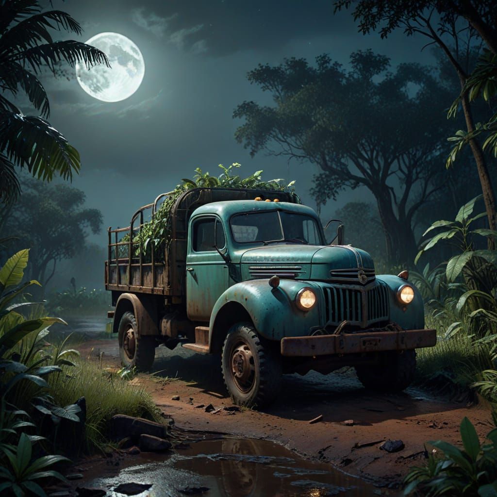 This photo-realistic concept art captures an abandoned vintage truck in the African jungle under a full moon. Eerie atmosphere with glistening dew, moonlit flora, and deep shadows in muted greens and blues.