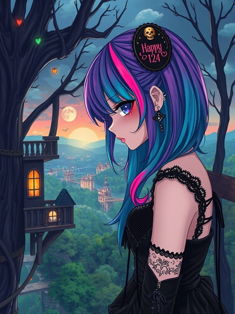 This image shows a sad kawaii goth girl with rainbow hair in a city of treehouses. She wears black leather and lace, creating a striking contrast.