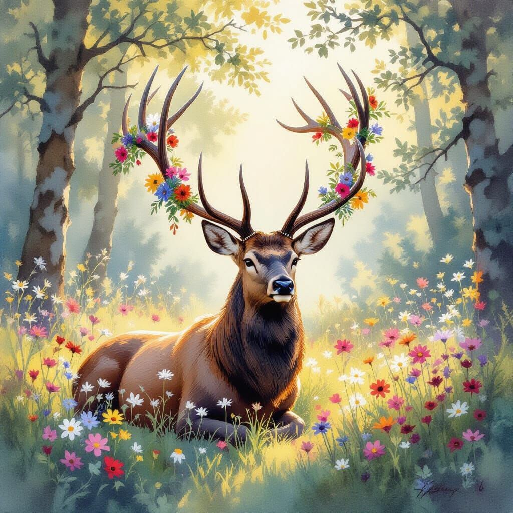 This image shows a majestic stag standing in a forest clearing, its antlers decorated with wildflowers. Soft watercolor effects and ethereal lighting create a scene of peaceful tranquility.