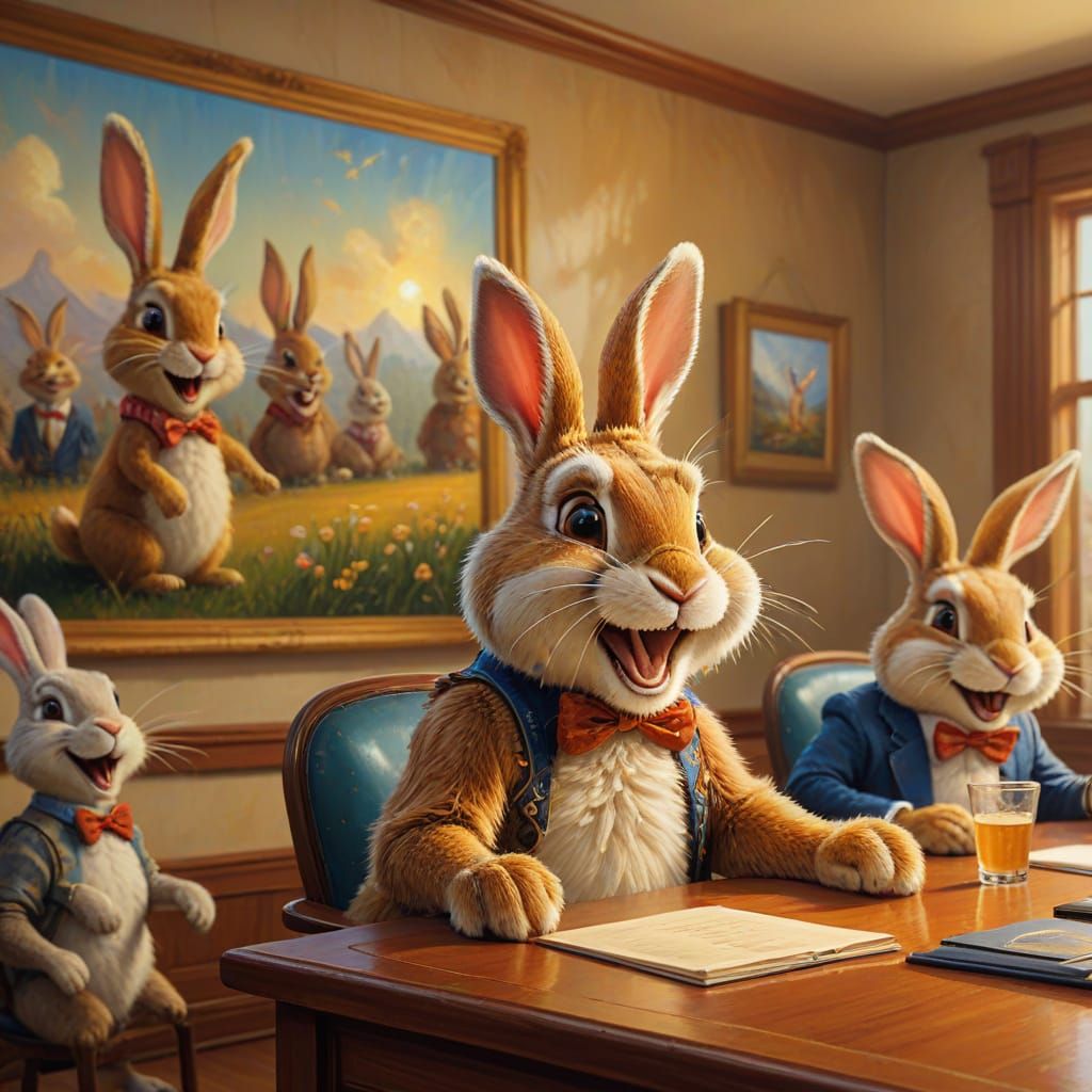 A humorous oil painting of a bunny in a conference room, watching a screen showing another bunny laughing. The artwork features whimsical brushstrokes, vivid colors and warm lighting in an impressionist style.